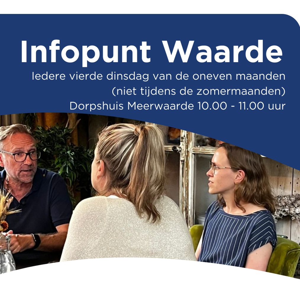 Vanaf 2026 is het infopunt Waarde van start gegaan. Bij de infopunten kunt u terecht met vragen over toeslagen, formulieren, werk, (financiƫle) zorgen, maar ook vragen over wonen, veiligheid, vrijetijdsbesteding en Wmo. Ook kunt u binnenlopen voor een kop koffie en/of een praatje.